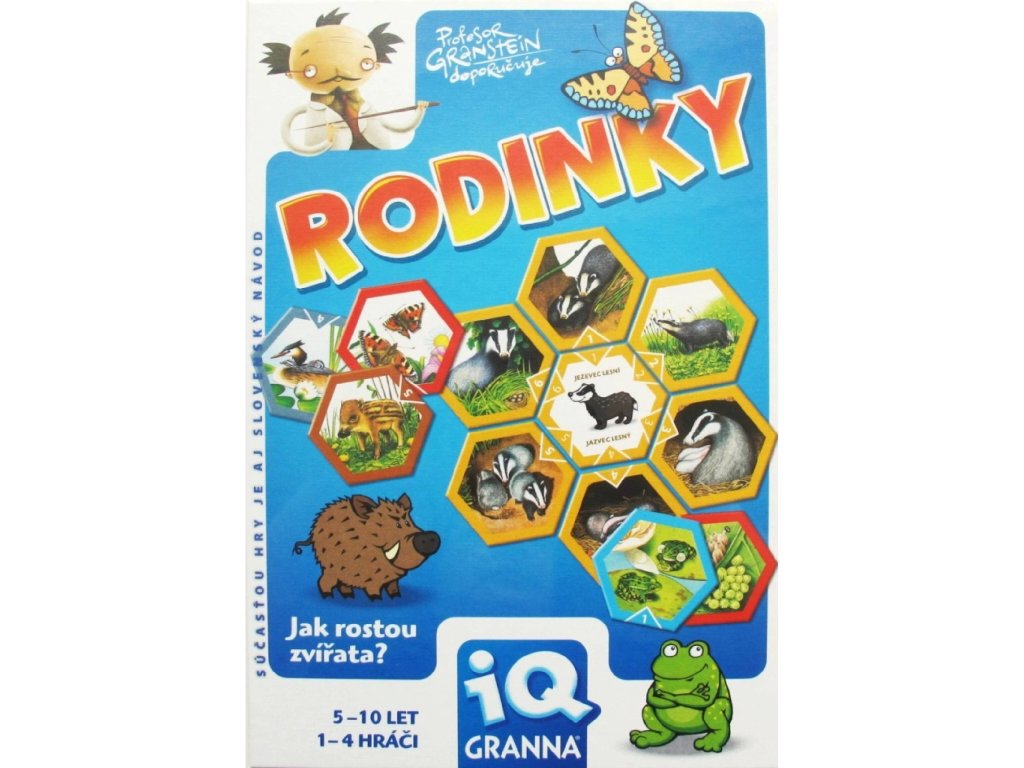 Díky této jedinečné hře GRANNA Rodinky pro 1 až 4 hráče od 5 do 10 let se děti seznámí s postupným vývojem osmi druhů volně žijících živočichů z naší přírody. Součástí hry je i zoologický komentář s barevnými ilustracemi a velký obrázek ukazující všechna popisovaná zvířata v jejich přirozeném prostředí.